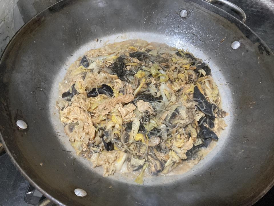 5. 翻炒到蘑菇開始變軟,加入嚮鈴、炸腐竹和已經浸泡好的粉絲、蠔豉和髮菜略為翻炒用蔬菜蓋上