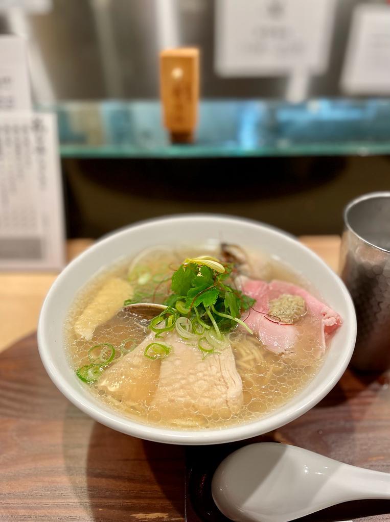 我們在店門前就跟職員下單,職員的服務態度貫徹日本的好服務,非常好,見我們是遊客就找了張英文餐單給我們。我們點了他家招牌的特製雞白湯拉麵(¥1500),另外又點了特製雞白湯醬油拉麵(¥1500),再點了一份蛤蜊牡蠣拉麵(¥1400)。進店喝了2杯冰水後,我的蛤蜊牡蠣拉麵就到了。這份拉麵的味道十分清爽,蛤蜊和牡蠣的味道非常突出,加入附上的柚子皮,清甜海產湯汁入口的時候帶出少許柚子味,令味道更清爽。拉麵裏的蛤蜊都非常飽滿,令我這貝類愛好者吃得很滿意。至於牡蠣就是小弟的至愛,我對熟的牡蠣無太大感覺,吃了一口只覺得牡蠣肥美,沒有異味,感覺沒有蛤蜊出彩。至於麵是幼身的拉麵,雖然沒有九州拉麵幼,但是麵質爽滑彈牙,非常不錯。